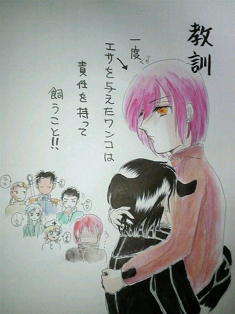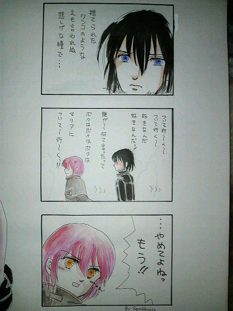 9巻のアジアンがマリアに付いていくシーンが「魔法のマコちゃん」EDっぽいという話で盛りあがったところ、なんとイラストを頂いてしまいました。 嬉しいです+ なので、ブログに載せてみます。 続きをクリックするとご覧になれます。 よかったらどうぞ~。 見たことあったのですが 「魔法のマコちゃん」なるものを知りませんでした。 すると薔薇マリVerのイラストが…! おおっ+ アジアンの恋心、 マリアのうっとおしく思う気持ち その心情を見事に描き表してあります。 やめてって顔じゃないですYO。 もう、マリアは何だかんだで甘いのだから。 って、そこの黒いヤツ! マリアの隙を絶妙に突いて、ああもう。 胸に顔を埋めるとか…っ 誰か~ けいさ…荊王呼んで来て下さい!! 荊王を呼んでも虐殺モードに入られたら ヤバいんでした。 こう、氷の目で見つめられると 普段いじりまくっている分 「殺されるんじゃないか」って 気分になってきます。 めんご!殺さんといて! ---------------------------------------------------------------------- イラストを頂くのが初体験だったもので、すっかり舞い上がってしまいました。とても嬉しかったので私も1枚描いてみました。 一日千秋さん素敵なイラストありがとうございました。 TrackbacksTRACKBACK URL : CommentsComment Form |
