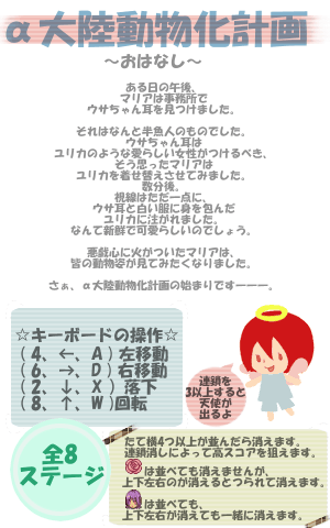 『落ちゲー:α大陸動物化計画』 サフニアやトマトクンたちを 動物化させてみたら…? 上のリンクからどうぞ。 (JAVAゲームなのでここからクリックOKです) もし灰色の画面が出たら 更新ボタンを押してみてください~。 (ゲーム自体を置き換えましたので 試験運用時の記録は 申し訳ありませんがリセットさせていただきました。 試験運用時の成績ベスト3は以下の通りです。 1位 4280点 2位 2551点 3位 2537点 遊んでくださりありがとうございます! 4000点台って凄いですね~v ※GAMEができないかたへ※ すみません…。 ①Java仮想マシンを入れていない場合 (入れ方はゲームを置いてあるページに書いてあります) JAVAの仮想マシンのバージョンの問題もあると思われます。 IE4とか3あたりからアップグレードを重ねてずっと使ってる人は、 動かない可能性があります。 Java仮想マシンが稼動していないマシンは、 マイクロソフトのサイトの指定手順に従って Windowsアップデートをかけてください。 Windows XPの初期バージョンには Javaがはいっていないのでこの手続きが必須となります。 そのほかWindowsで、ゲームの部分が×印になったり、 グレーのままであるとかいう人も、 このMicrosoft VM をインストールすると直る可能性があります。 Mac OS 8や9ではIE5.0以上で動きます。 MacではMRJというJava仮想マシンプログラムを システムにインストールしないと動かない場合があります。 Mac OS Xでは不具合が報告されています。 またMac OS Xは買ってきたままでは Javaオフになってるので、オンにしてください。 (「あんこはうす」より) ②JAVAが入れてあるにも関わらず動かない場合 手動でjavaを立ち上げてください。 (スタート→すべてのプログラム→Java Web Start) ③JAVAが立ち上がっているにも関わらず動かない場合 一度ゲームのページを閉じてもう一度開いてみてください。 ④スペックが低い場合 (マシンの実装メモリが少なすぎる←32MBなど) 在駐ソフトのせいで(リソース不足)動かないこともあるようです。 その場合は在駐ソフトなどを閉じて リソースを確保すれば動くと思います。 ⑤ ネットスケープを使ってる、 ⑥ そのほか怪しいブラウザを使ってる、 ⑦プロバイダのプロキシが古い、 ⑧LANのファイアーウオールがブロックしてる、 ⑨自分あるいは共同使用者などがセキュリティをいじって JAVAの一部を無効にした (グレーになるというのはこれを完璧に無効にした状態と思われます) などなど色々考えられますが私はよく分かりません。 参照:(2008年8月31日検索) http://www5e.biglobe.ne.jp/~crown/pink/sophy_crown.htm ○落ちGE!のコツ○ http://homepage2.nifty.com/crow-of-amber_grow/ochi.htm 2008.08.29 Fri 01:41:50 10巻 第2勝負 まとめ第二勝負をまとめてみました。 |