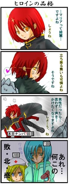 ・3巻でマリアがネクロマンサーを倒すところ ・4巻のルイとりりぃの会話 20くらい? ・布教活動 ・作者さんの呼び方 ・BUNBUN先生→BUNBUN先生 十文字青先生をブルー先生と呼ぶのは MOTHER2でブルーブルー教という教団が出てきて てなわけでブルー先生と呼んでます。 ただ、ブログ以外ではちゃんと十文字青先生と呼んでいるので BUNBUN先生がそのままなのは 私の地元のケーブルテレビの愛称が「BUNBUNテレビ」でした。 ・作者さんへ一言 薔薇マリ人気の理由の1つは十文字青先生の ・絵師さんへ一言 最初はそんなに好きなタイプの絵ではなかったんですけど ・漫画家さんへ一言 絵自体は初めそんなに好きではなかったんですけど …近いうちにファンレター送ります。 せーのっ 2008.04.14 Mon 00:44:15 エチャ絵チャット(以下エチャ)に参加させていただきました。 エチャ参加初めてだったので もう緊張しっぱなしでした。 エチャの内容は 裏薔薇的マリア専門のカメラ小僧・アジアン とか ユリカに怒られるアジアン とか 新聞部なヨグ とか ピクニックとか リクエストされたキャラを描くのとか… まさか春爛漫ピクニックが セーラー祭りになるなんて*+ 皆さんノリが良くて、すごく楽しかったです。 おまけにサララ~と美麗絵を描かれていて 1人ずっと感動していました。 退室時に変なボタンを押してしまい 出たり入ったりしてご迷惑かけました;; 帰ろうとしたら盛大にこけた感じで 己のお馬鹿さに恥じ入りました。あわわ。 また機会があったら参加したいなぁと思います。 右の絵はエチャ室の使い方を知るために練習した リーチェです。 ところで 裏薔薇は色々なところで描かれていますが マリアの制服って男子と女子どっちが いいのでしょうね。 エチャ中、 nekoyaさんから「キャロットで!」という素敵提案を頂き 衝撃を受けました。 その手があったか! 本物の裏薔薇での制服や 世間では男子と女子の制服どっちが人気なのでしょうね。 気になります。 |